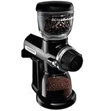 The KitchenAid Pro Line Burr Coffee Grinder grinds whole coffee beans for the best tasting cup you ve ever brewed! Whether you re grinding for espresso, drip coffee, French Press or something in-between, 15 different grind settings give you plenty of options. The commercial-quality burrs actually flake coffee instead of crushing it, so you don t lose any of the essential oils that give coffee its full flavor. Turning at just 450 RPMs, this burr grinder also ensures those oils will not burn off due to frictional heat. Special gears control the delivery of beans to the burrs for a better grind consistency, and a plastic seal helps position the coffee bin under the grinding spout to prevent grounds from escaping. Now for the real plus: the Kitchen Aid Pro Line Coffee Grinder has a bean hopper and coffee bin made of GLASS rather than plastic to eliminate static cling. Glass means less cleanup, plus fluffy-looking grounds that won t cling to each other or the grinder. And since the hardy all-metal construction means this baby is built to last, this may be the last grinder you ll ever buy. Die-cast metal construction Precision stainless steel cutting burrs 15 selectable grind options 7-ounce glass hopper and coffee bin Low RPM Operation Simple burr access Burr cleaning brush Easy to cleanManufacturer: KitchenAidManufacturer Style: Pro LineModel: KPCG100NPColor: Onyx BlackMaterial: Die-cast metal housingSize / Capacity: 7 oz.Width: 6 inchesDepth: 10 1/2 inchesHeight: 13 1/2Weight: 10 lbs.Volts / Watts: 120 volts / 150 wattsSpecial Features: Wood handled brush removes grinds thoroughlyCleaning / Care: Wipe clean with damp clothWarranty: 2 year hassle-free Read more