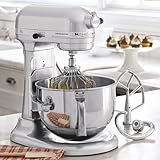 This exclusive 6-quart stainless-steel bowl is large enough for double batches of cookie dough. Soft Start feature prevents splash-out. Planetary mixing action thoroughly incorporates and combines all ingredients. Attachment hub lets you turn your mixer into a multipurpose kitchen machine. Includes a clear pouring shield, burnished flat beater, burnished PowerKnead spiral hook, and professional wire whip attachment for maximum volume in whipping cream or egg whites. Elegant metallic chrome exclusive to CHEFS™. Model: KP26M8XMC.