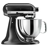 Retro styled and easy to use, the KitchenAid Artisan stand mixer is the perfect kitchen companion. Employing a unique tilting head to facilitate bowl and content removal, this mixer is undeniably handy. Hassle-free total replacement warranty and one-year full warranty. Model KSM150PS.KitchenAid's Artisan stand mixer is a substantial piece of equipment: 325 watts of mixing power make child's play of creaming butter, kneading dough, and whipping cream. The kid in you will appreciate how quick and easy it is to mix up a batch of cookie dough. This model comes with three attachments: a flat beater for making batter, meat loaf, and all textures in-between; a wire whip for egg whites, mayonnaise, and more air-infused creations; and a hook for mixing and kneading yeast doughs. All three are solidly constructed and easily secured to the beater shaft with a simple twist. This model also includes a pouring shield for guiding ingredients to their proper destination, and the bowl itself locks tight to the base. Standing about 15 inches high, jutting out a foot, and weighing more than a grown woman's bowling ball, this stand mixer isn't the sort of appliance you'll wipe down and put away. Better to find a square foot of free counter space for easy access; besides, this machine is as pretty as it is rugged--you'll want to show it off. --Betsy Danheim