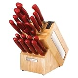 Set Includes: 8-inch Chef, 8-inch Slicer, 7-inch Santoku, 5-inch Santoku, 5-1/2-inch Serrated utility, 4-1/2-inch Fine Edge Utility, 3-1/2-inch Parer, Birds beak Parer, 8 Stamped Steak Knives, Shears, Natural Block with built-in sharpener. Features: High carbon forged stainless steel blade, Contoured comfortable grip handle perfectly balanced and weighted for ease of use. Block includes a built-in Knife sharpener. Read more