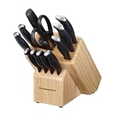 Set Includes: 8-inch Chef, 8-inch Slicer, 5-1/2-inch Serrated Utility, 5-inch Santoku, 3-1/2-inch parer, (4) 4-1/2-inch Steaks, Shears, Sharpener, Block. Features: Stamped handle with durable blades made from high carbon stainless steel, Perfectly balanced and weighted for ease of use. Read more