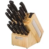 Set Includes: 8-inch Chef, 8-inch Slicer, 7-inch Santoku, 5-inch Santoku, 5-1/2-inch Serrated utility, 4-1/2-inch Fine Edge Utility, 3-1/2-inch Parer, Birds beak Parer, 8 Stamped Steak Knives, Shears, Natural Block with built-in sharpener. Features: High carbon forged stainless steel blade, Contoured comfortable grip handle perfectly balanced and weighted for ease of use. Block includes a built-in Knife sharpener. Read more